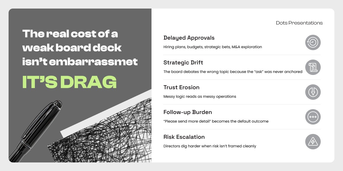 When board materials are unclear, the cost isn't just a bad meeting. It compounds. Hiring plans, budgets, and strategic bets get delayed because approvals stall. The board debates the wrong topic because the actual ask was never anchored. Messy logic reads as messy operations, and trust erodes quietly. "Please send more detail" becomes the default outcome. And when risk isn't framed clearly, directors dig harder, which changes the temperature of the relationship.