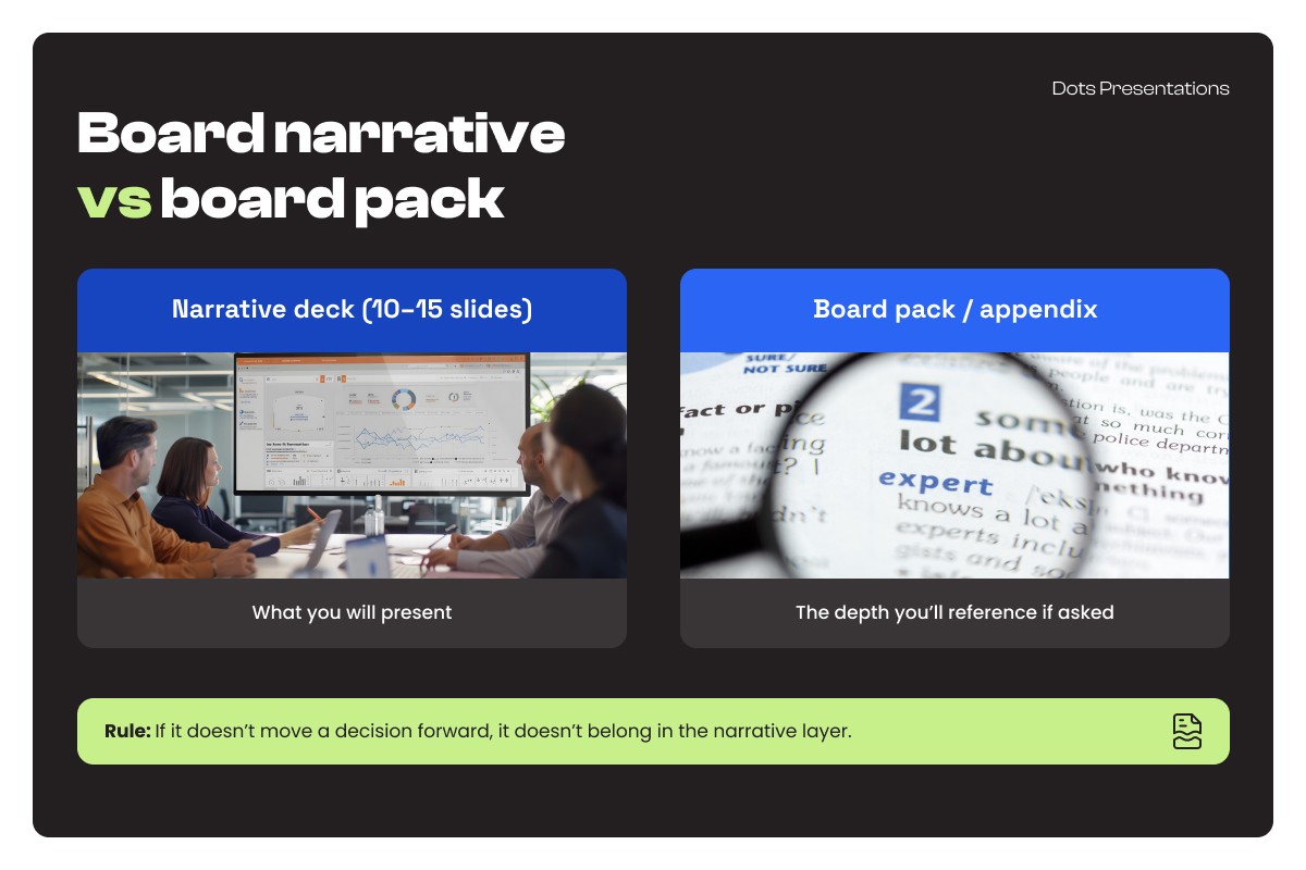 The fix is to create two distinct layers. The narrative deck, somewhere between 10 and 15 slides, is what you present. The board pack or appendix is the depth you reference if someone asks. Research on board materials highlights how packs become the "elephant in the boardroom" when they're bloated and unfocused. (NACD)