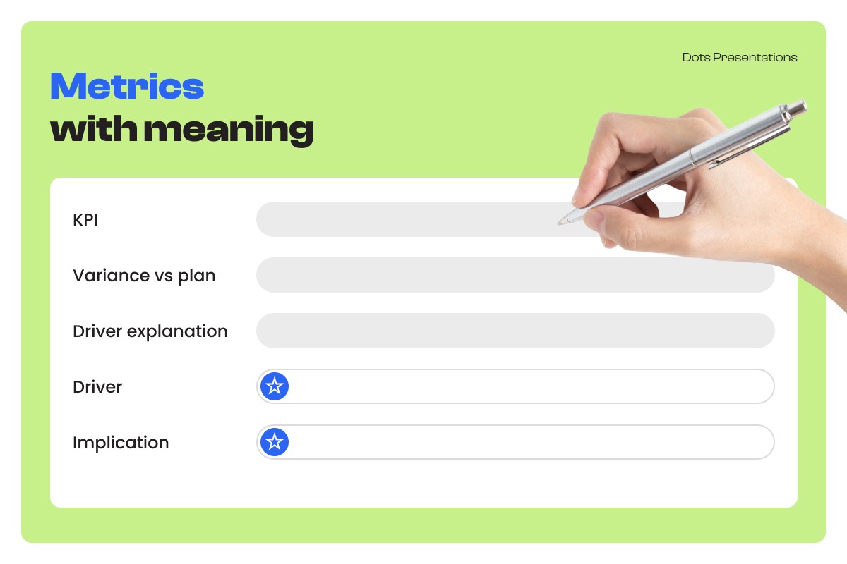 KPI / Variance vs plan / Driver explanation / Implication