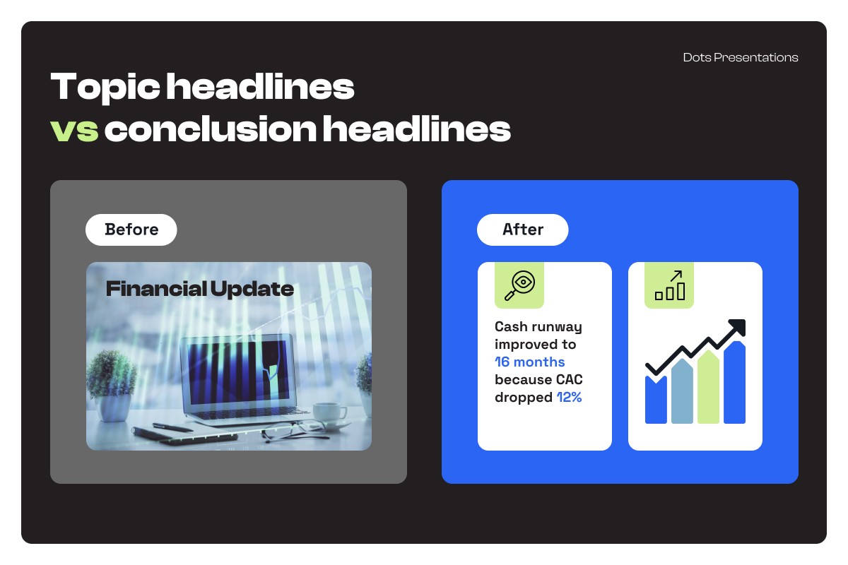 Every slide headline should be a conclusion, not a label. Before you finalize any slide, ask: if someone read only the headline, would they know what you want them to think or do? If the answer is no, rewrite the headline.