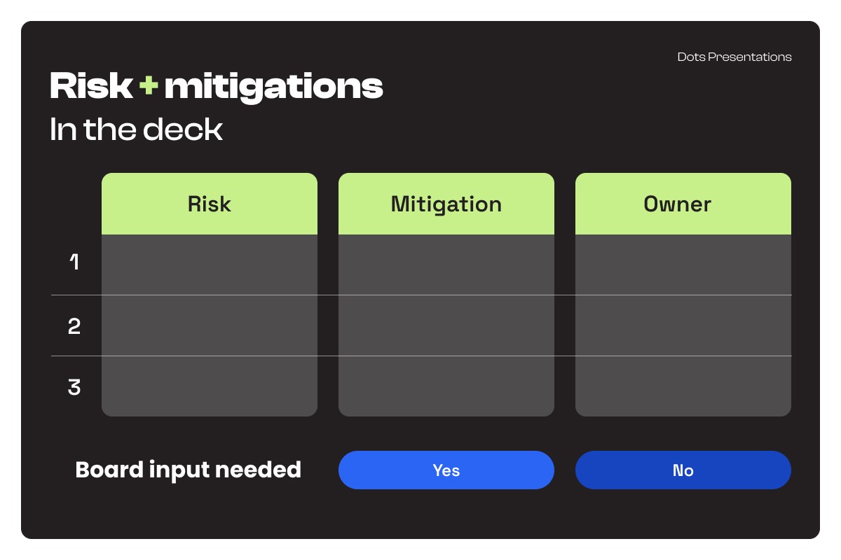 Show your top three risks, ranked. Note what's changed since the last meeting. Assign a mitigation plan and an owner to each. Then add one field that most teams skip: "Board input needed: yes / no." That last line steers the meeting toward valuable feedback and better oversight, rather than ending with a recap that doesn't change anything. (Harvard Business Review)