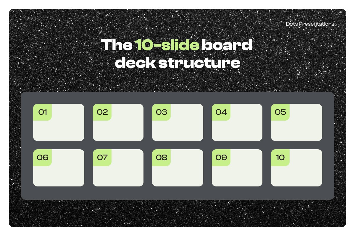 Investor and operator templates converge on a consistent principle: a board deck should structure discussion and decisions, not overwhelm. (Creandum) Here's the structure we recommend: