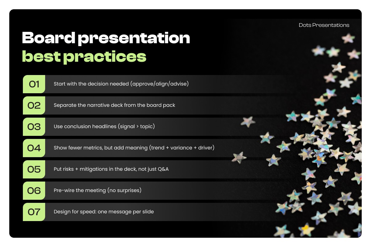 Seven practices separate decision-ready board decks from everything else: