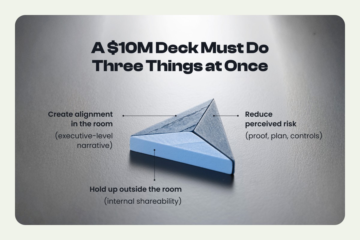 A $10M deck doesn't win by saying more. It wins by making the buying group agree on the same story fast and giving them everything they need to defend it internally.