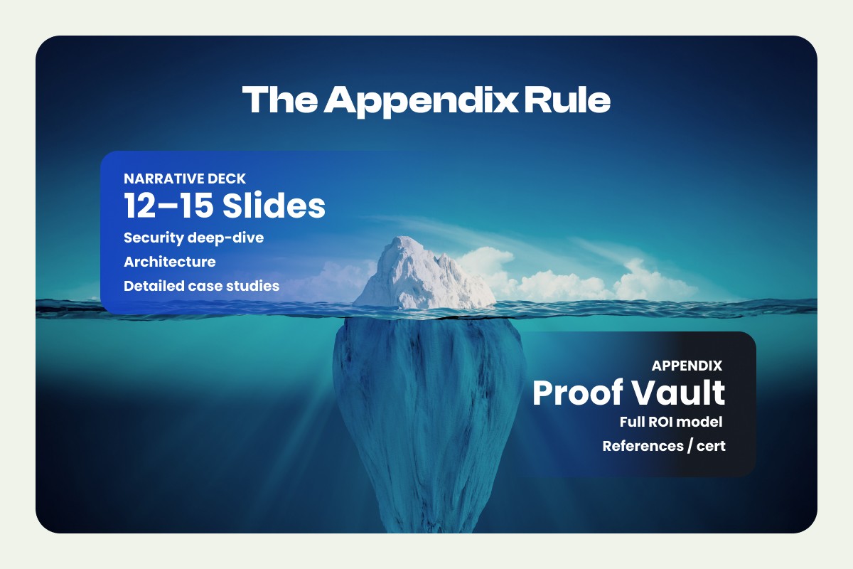Your main deck should be 12 to 15 narrative slides. Everything else goes into a labeled appendix: security deep-dives, architecture diagrams, detailed case studies, the full ROI model, references, and certifications.