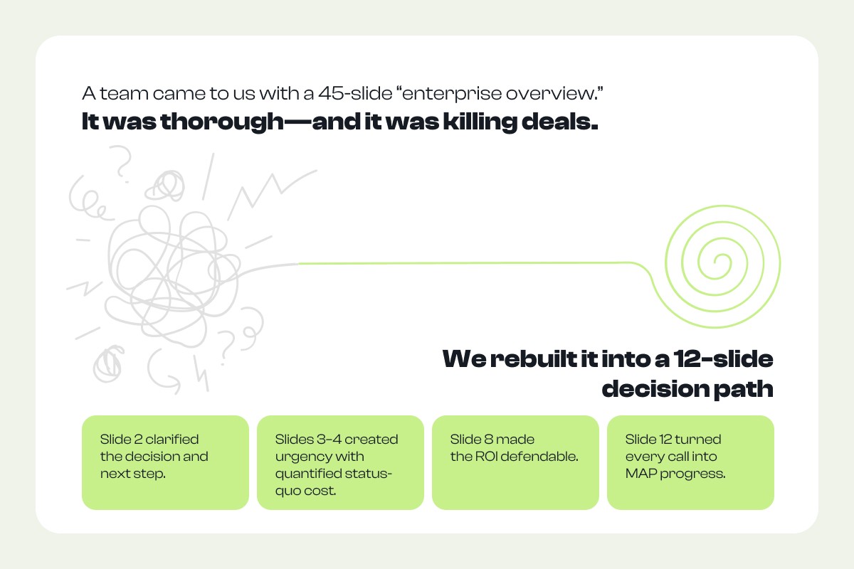 A team came to us with a 45-slide "enterprise overview." It was thorough, and it was killing deals.