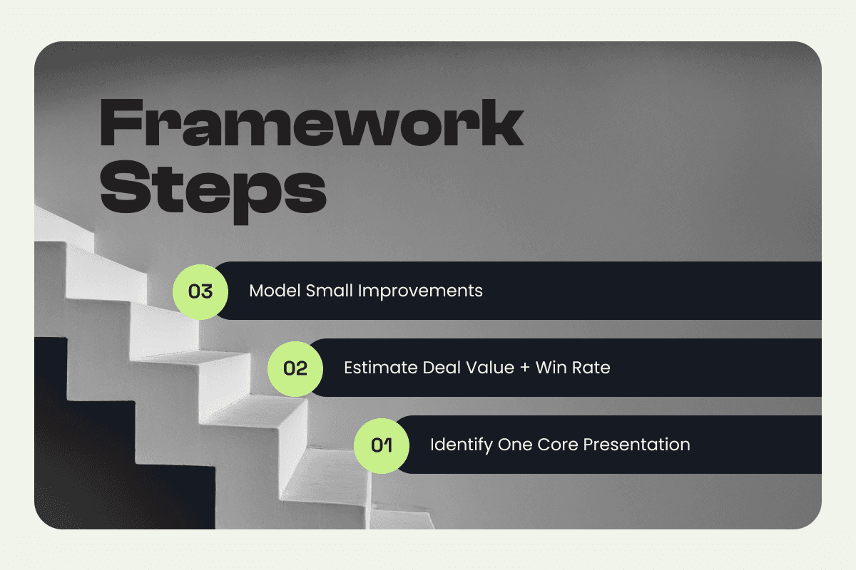 Clear narratives outperform exhaustive ones. Decision-makers don't reward thoroughness. They reward confidence and clarity. When presentations open with intent, structure around a decision, and surface evidence only when needed, buyers feel safer saying yes. Even a 2 to 3 percent increase in win rate at enterprise ACVs dwarfs the cost of the design investment.