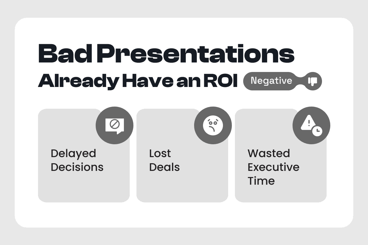 The right question is what your current presentation approach is already costing you in delayed decisions, lost deals, and wasted executive time. Because presentations aren't a nice-to-have asset. They're the interface between your strategy and someone else's decision. And every unclear slide carries compound interest against you.