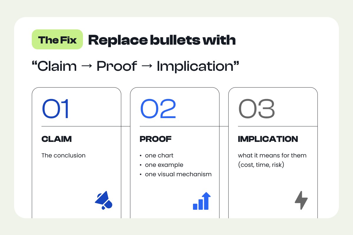 Bullet points aren't costing you money because they're ugly. They're costing you money because they pull attention away from your narrative, hide the decision, replace proof with claims, and slow meetings into review mode.
