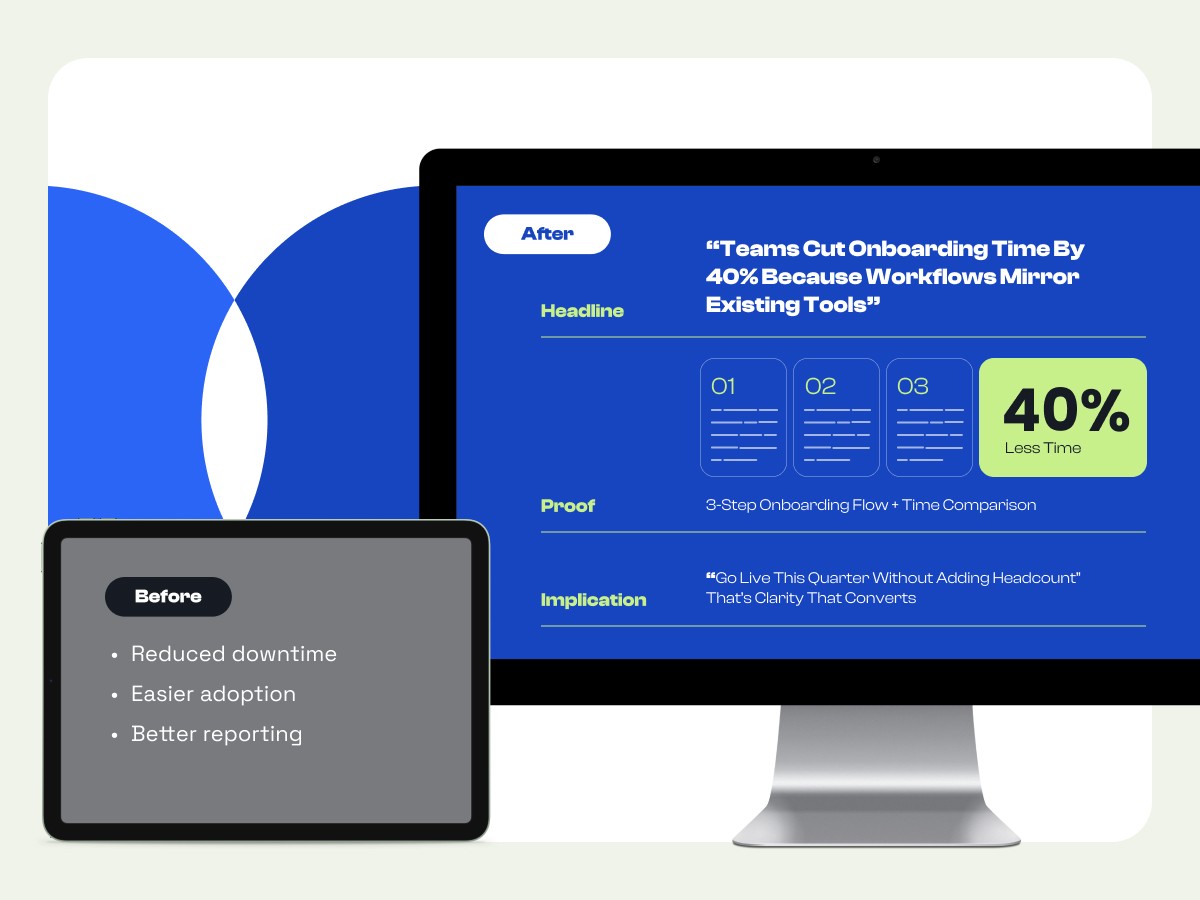 Headline: "Teams cut onboarding time by 40% because workflows mirror existing tools"