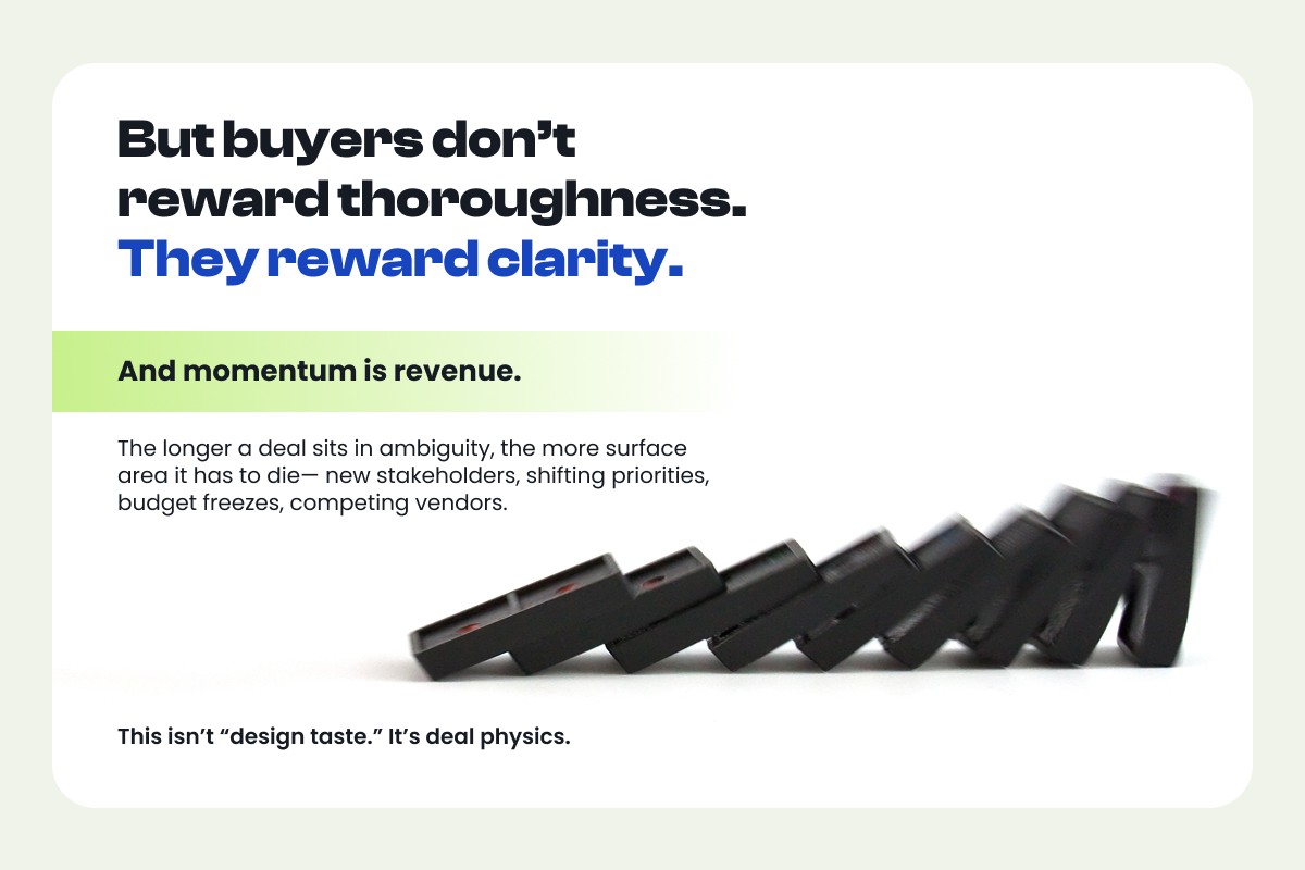 But buyers don't reward thoroughness. They reward clarity. And momentum is revenue.