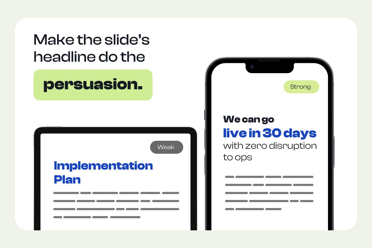 A topic headline like "Implementation Plan" tells them nothing. A conclusion headline like "We can go live in 30 days with zero disruption to ops" tells them everything they need to feel confident. Support that headline with one evidence element: a simple timeline, a three-step flow, or a single metric callout. One message. One proof. That's the slide.