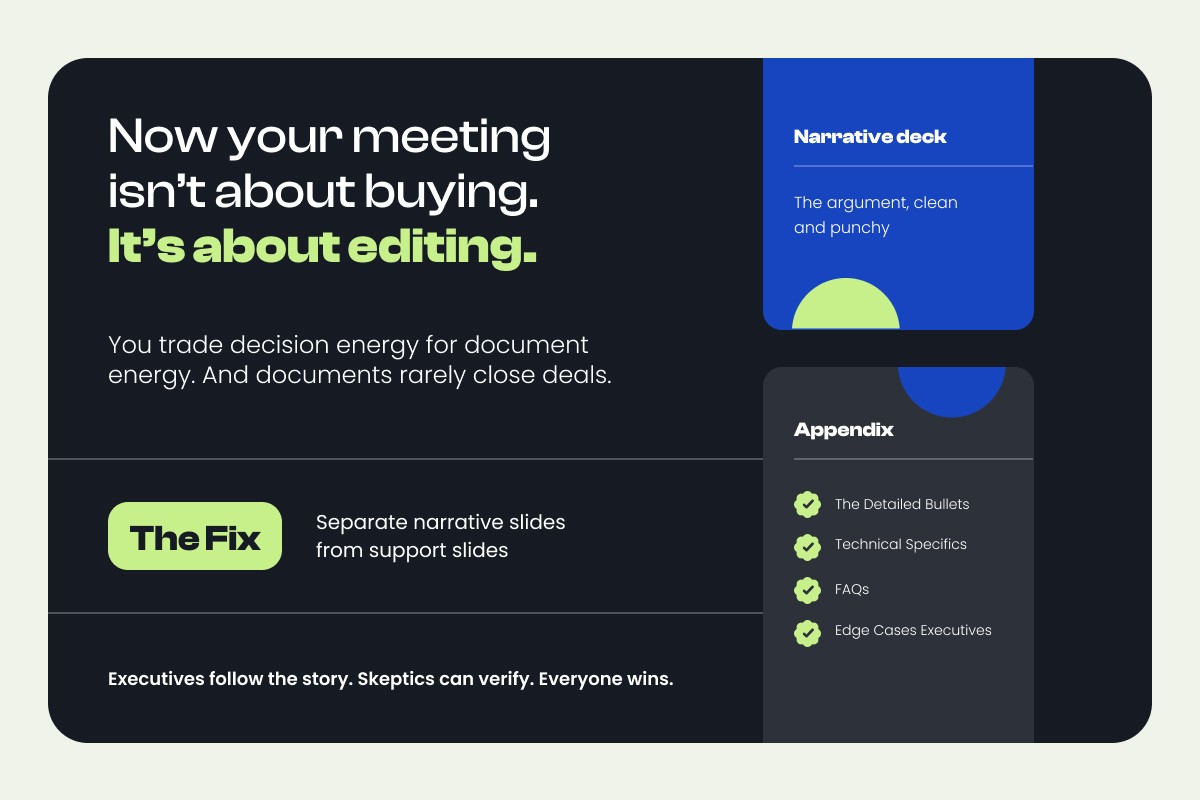 Stakeholders start tweaking phrasing instead of evaluating the recommendation. "Can we reword bullet three?" "Add another point about compliance." "This needs more detail." Now your meeting isn't about buying. It's about editing. You trade decision energy for document energy. And documents rarely close deals.