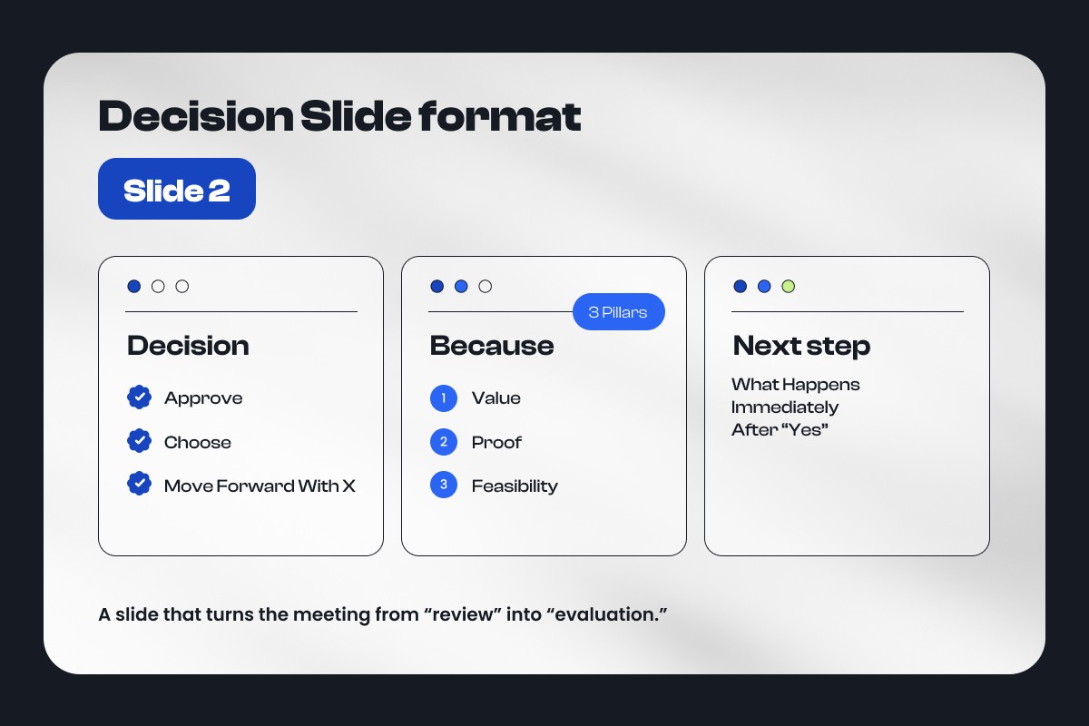 Decision: Approve / Choose / Move forward with X Because: 3 pillars (value, proof, feasibility) Next step: What happens immediately after "yes"