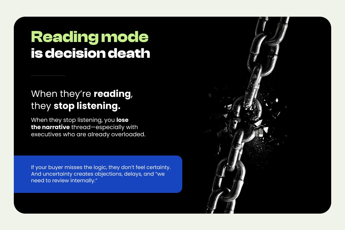 That sounds harmless until you remember what you actually need in a sales conversation: attention, comprehension, and conviction. When they're reading, they stop listening. When they stop listening, you lose the narrative thread, especially with executives who are already overloaded. If your buyer misses the logic, they don't feel certainty. And uncertainty creates objections, delays, and "we need to review internally."