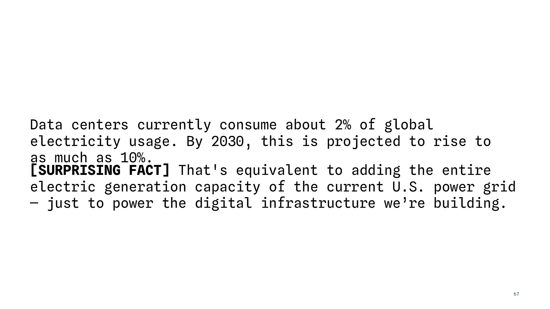 The deck now makes the scale of AI's infrastructure challenge impossible to ignore. Statistics that were once buried in draft text anchor every slide, giving the presenter a clear visual to point to in every conversation. The presentation works as well forwarded over email as it does in a live pitch, because the visuals carry the argument without needing a speaker to decode them.