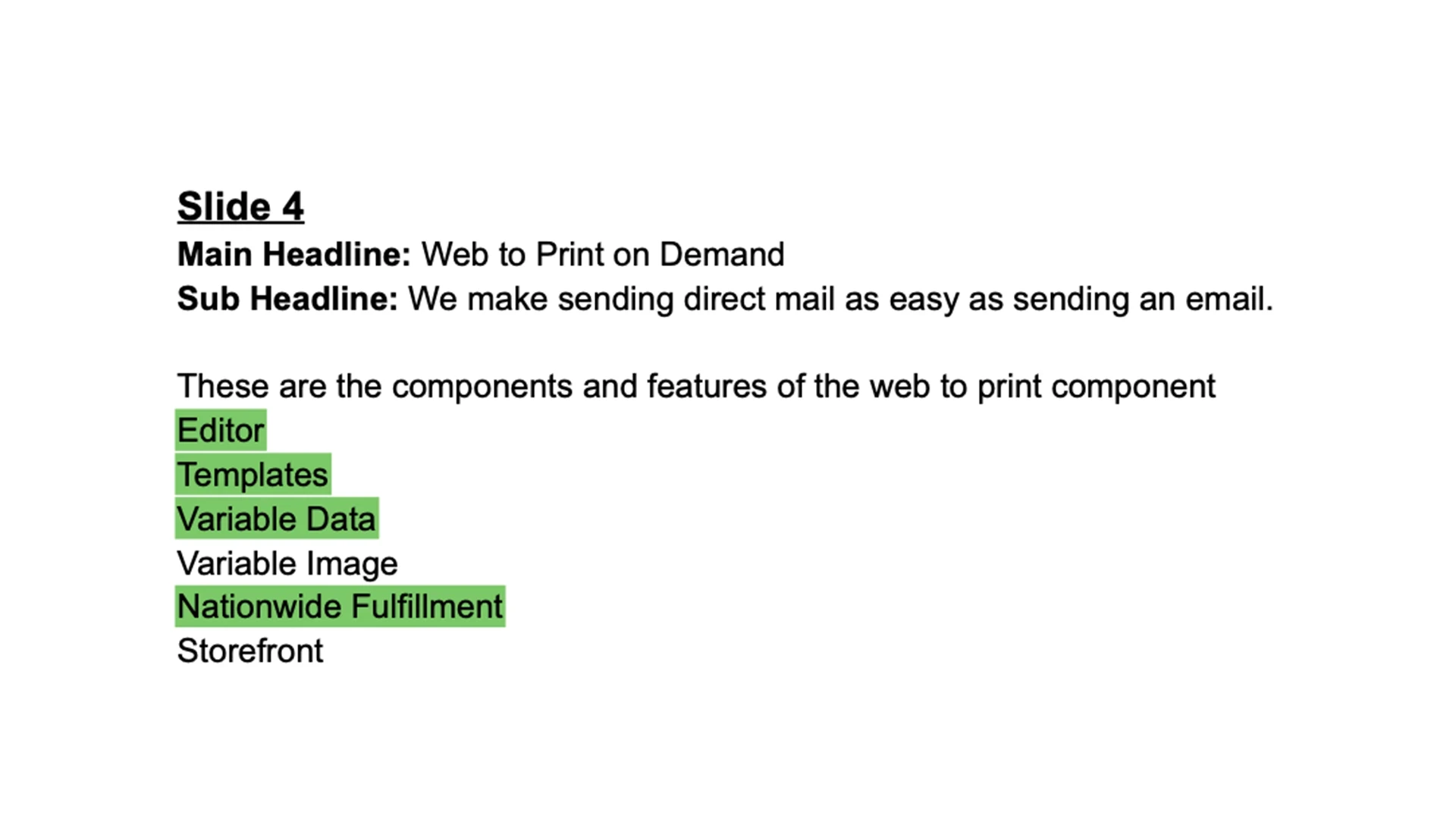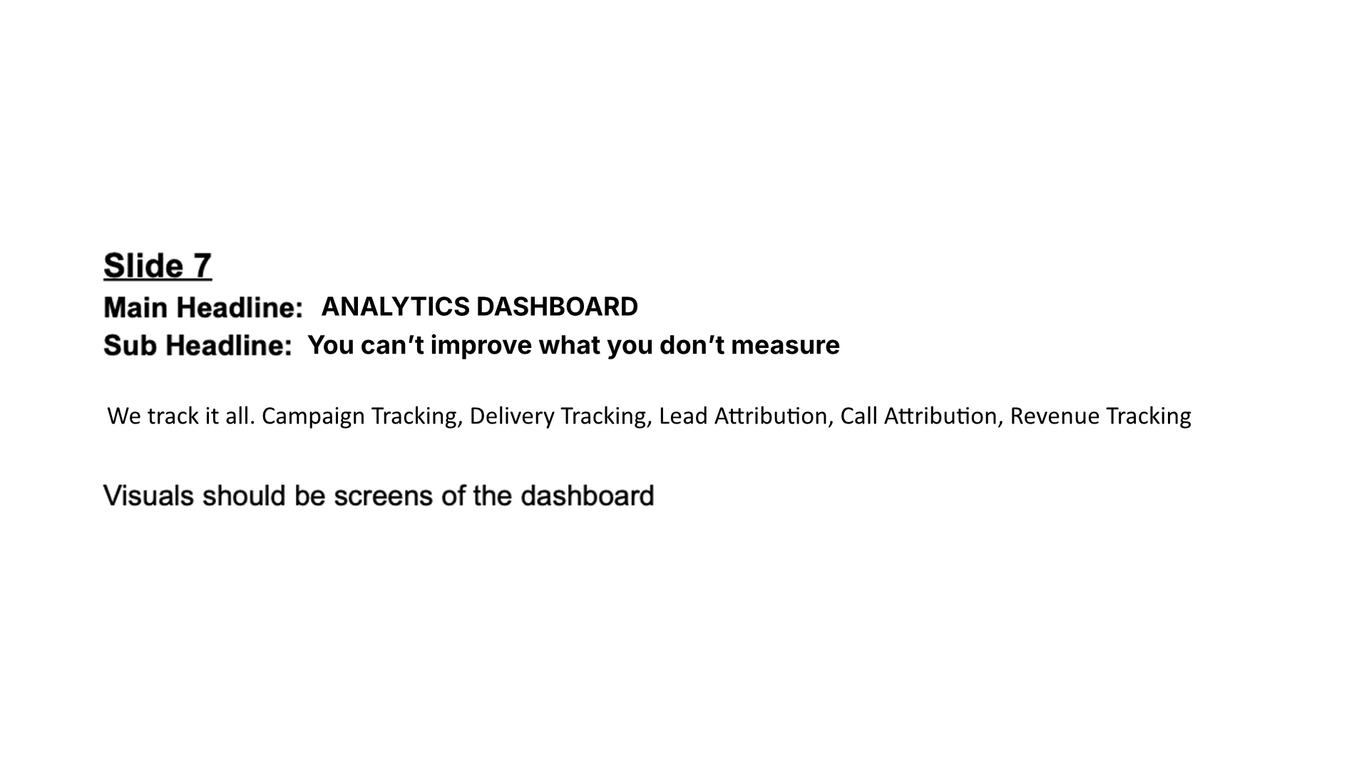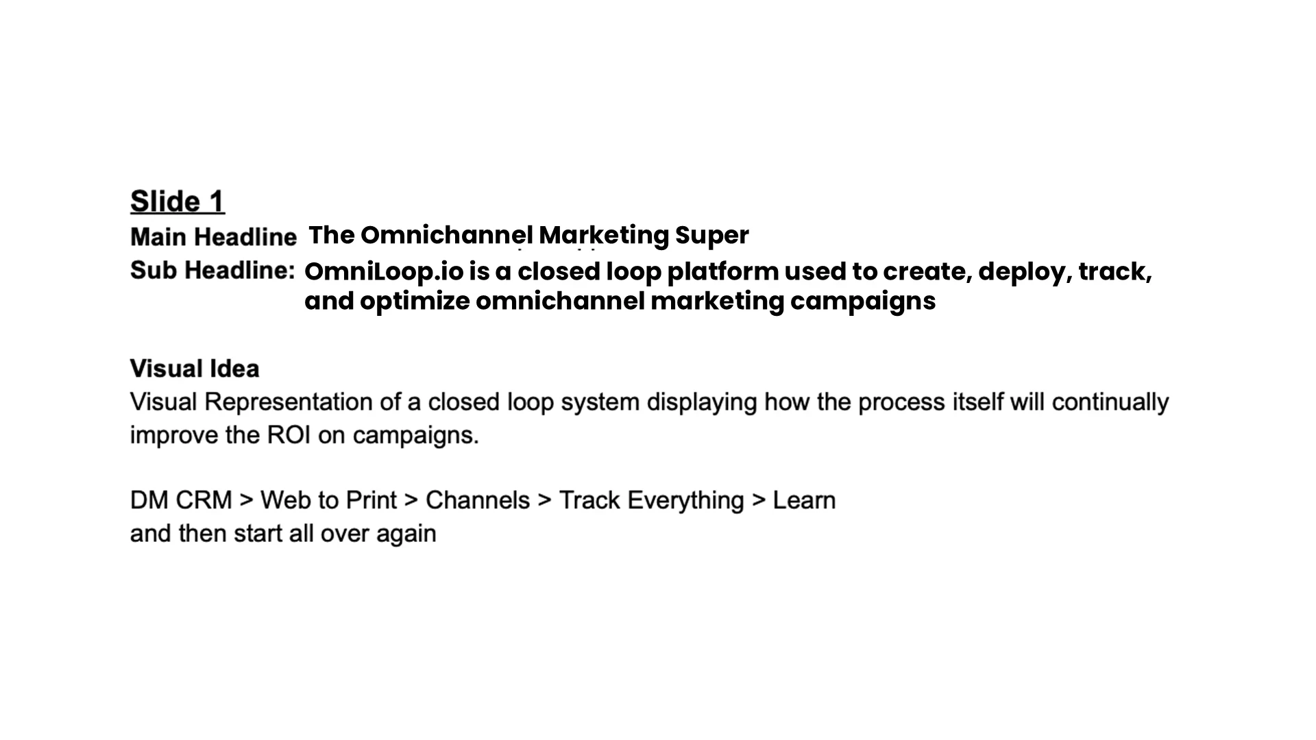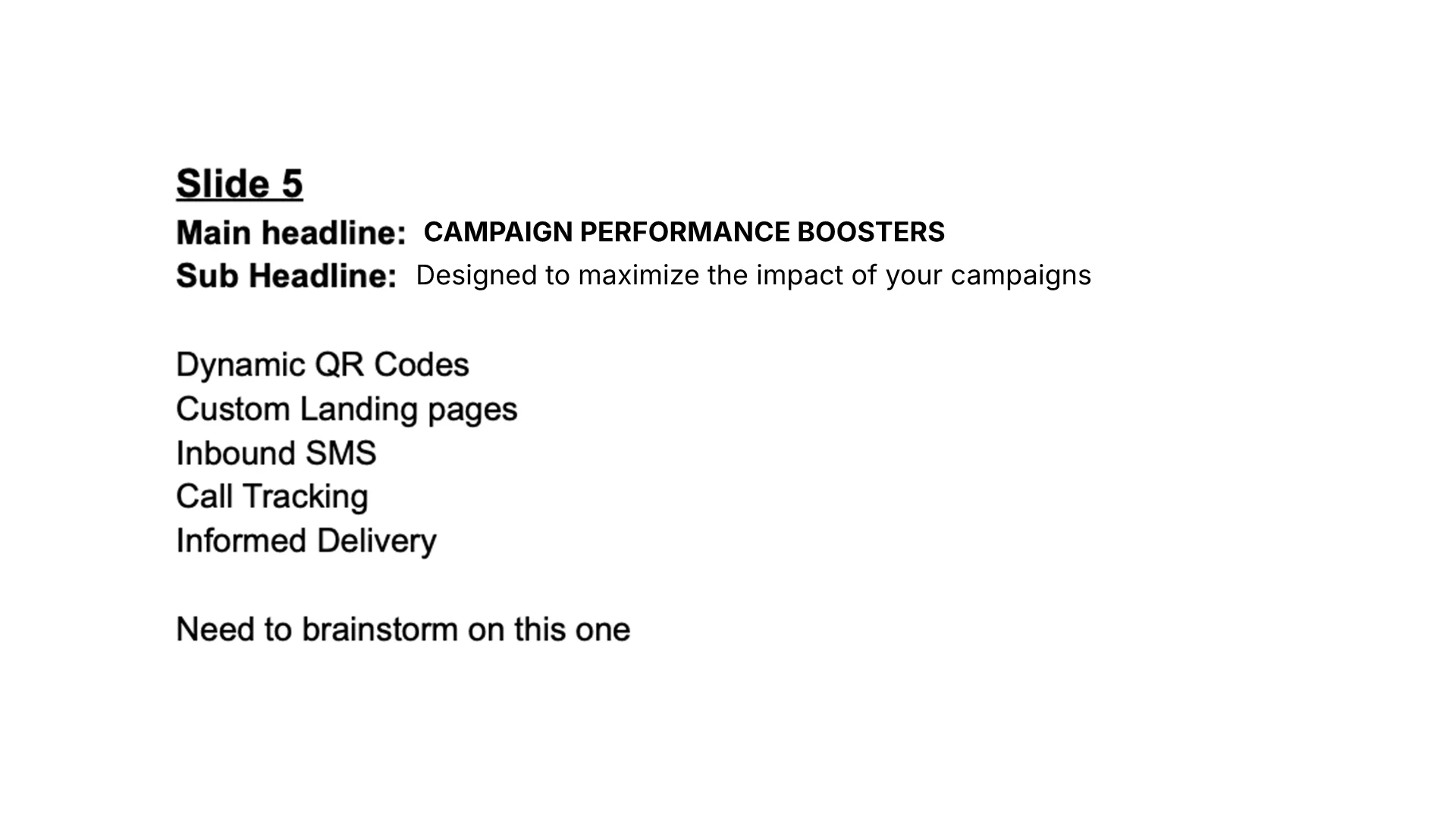 This company had built a powerful omnichannel direct mail platform, but their pitch deck was still a text outline. Literally. Slides were plain white pages with headlines, feature lists, and notes like "need to brainstorm on this one." The product was real, the stats were compelling, but nothing in the deck showed prospects what they'd actually be buying. For a platform that promises to simplify complexity, the presentation made everything feel hypothetical.