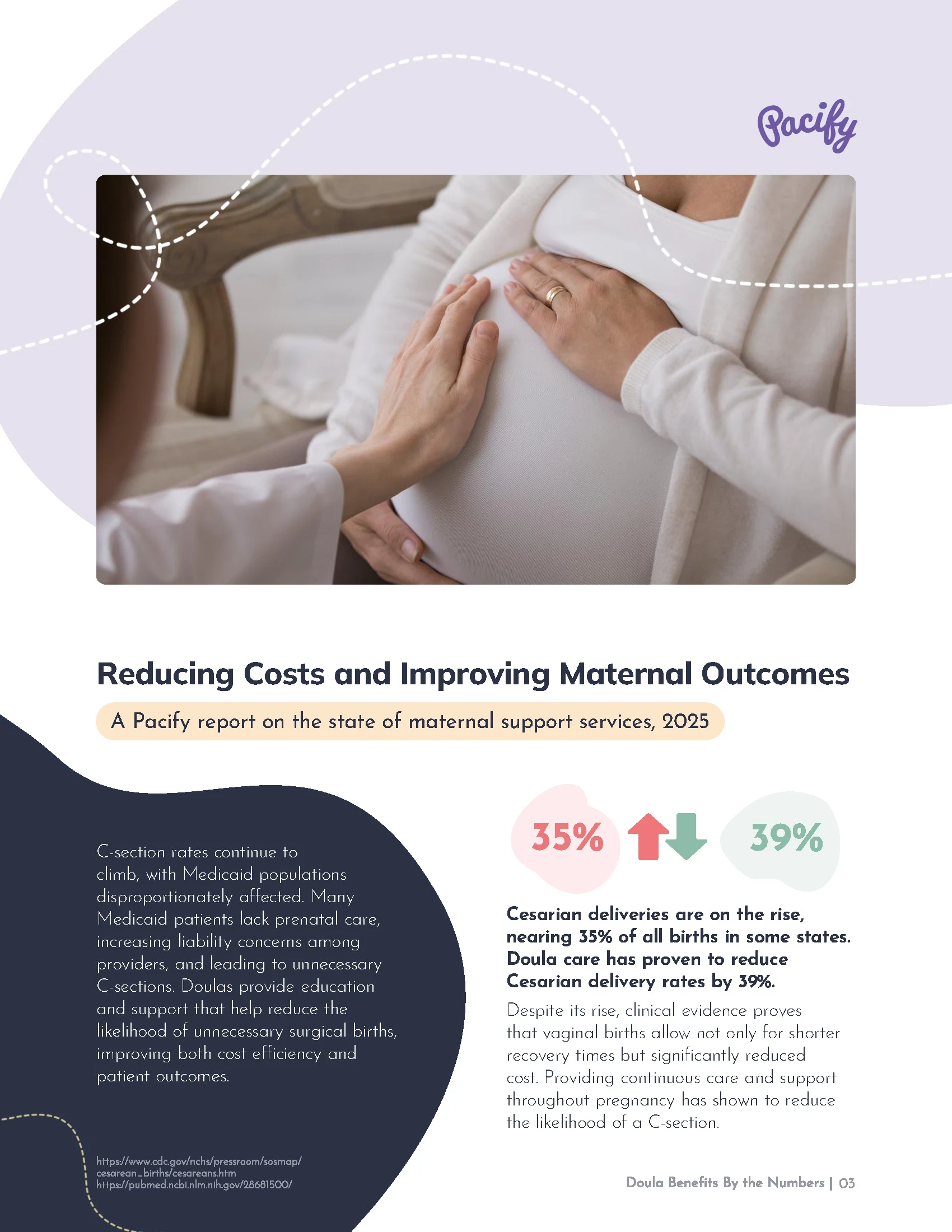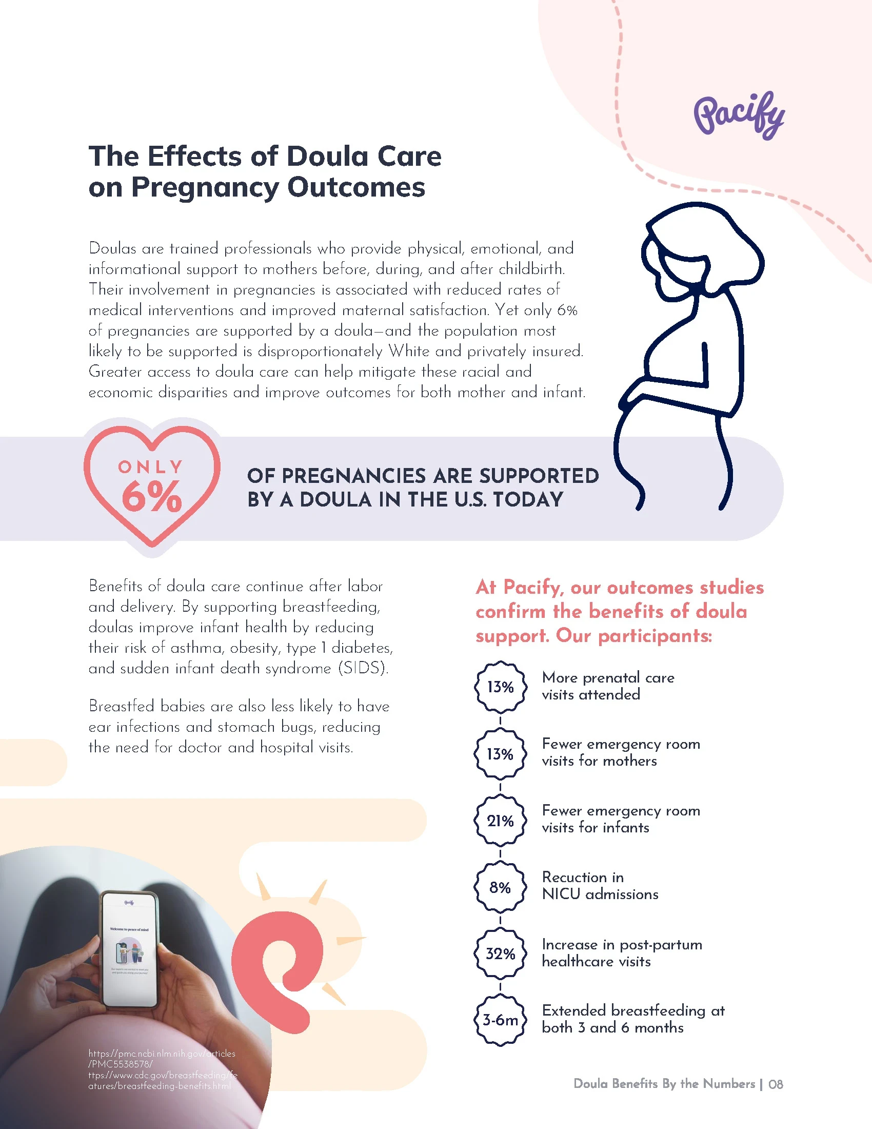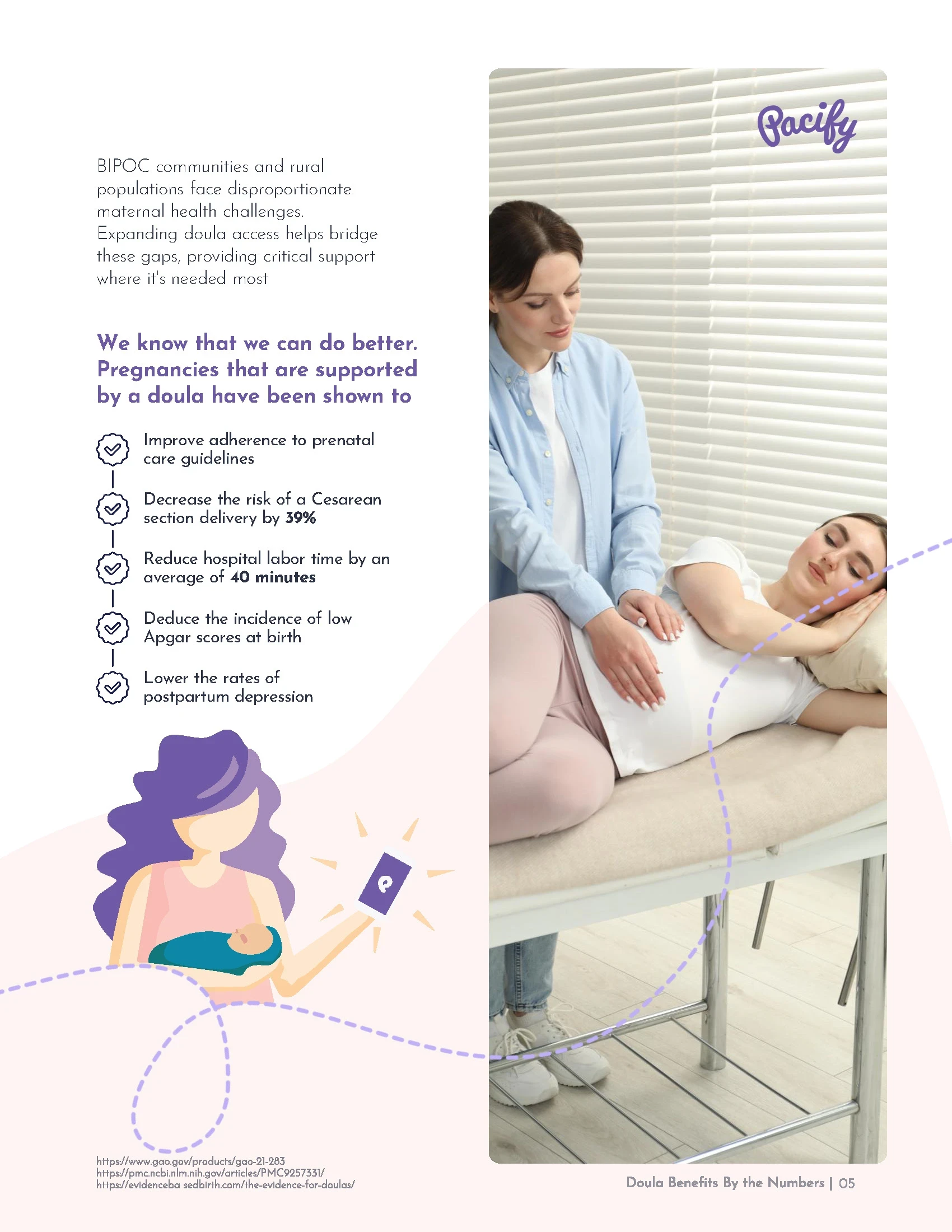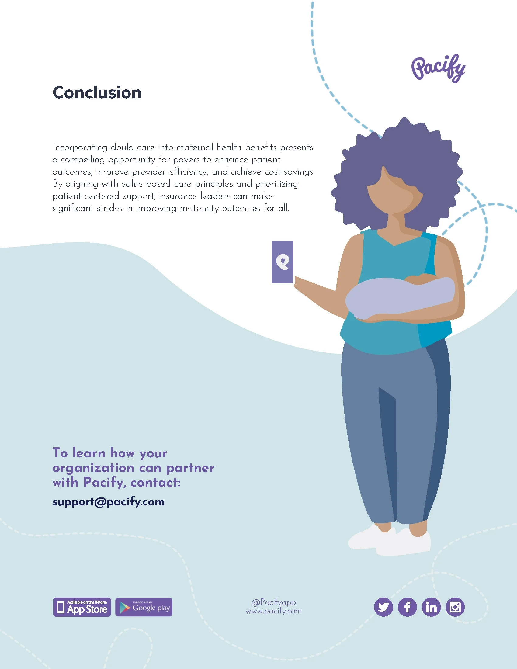 The white paper now works the way Pacify needs it to: as a standalone document that makes the case for doula coverage without anyone from the team in the room to explain it. Payer executives can scan the key takeaways page and immediately understand the cost argument, or read deeper into the outcome data and sourcing when they're ready to evaluate. The design treats every statistic as an opportunity to move the conversation forward, from maternal mortality disparities to Pacify's own 93% satisfaction rate. It's the kind of document that gets forwarded from a benefits director to a CFO, and still holds up when it arrives.