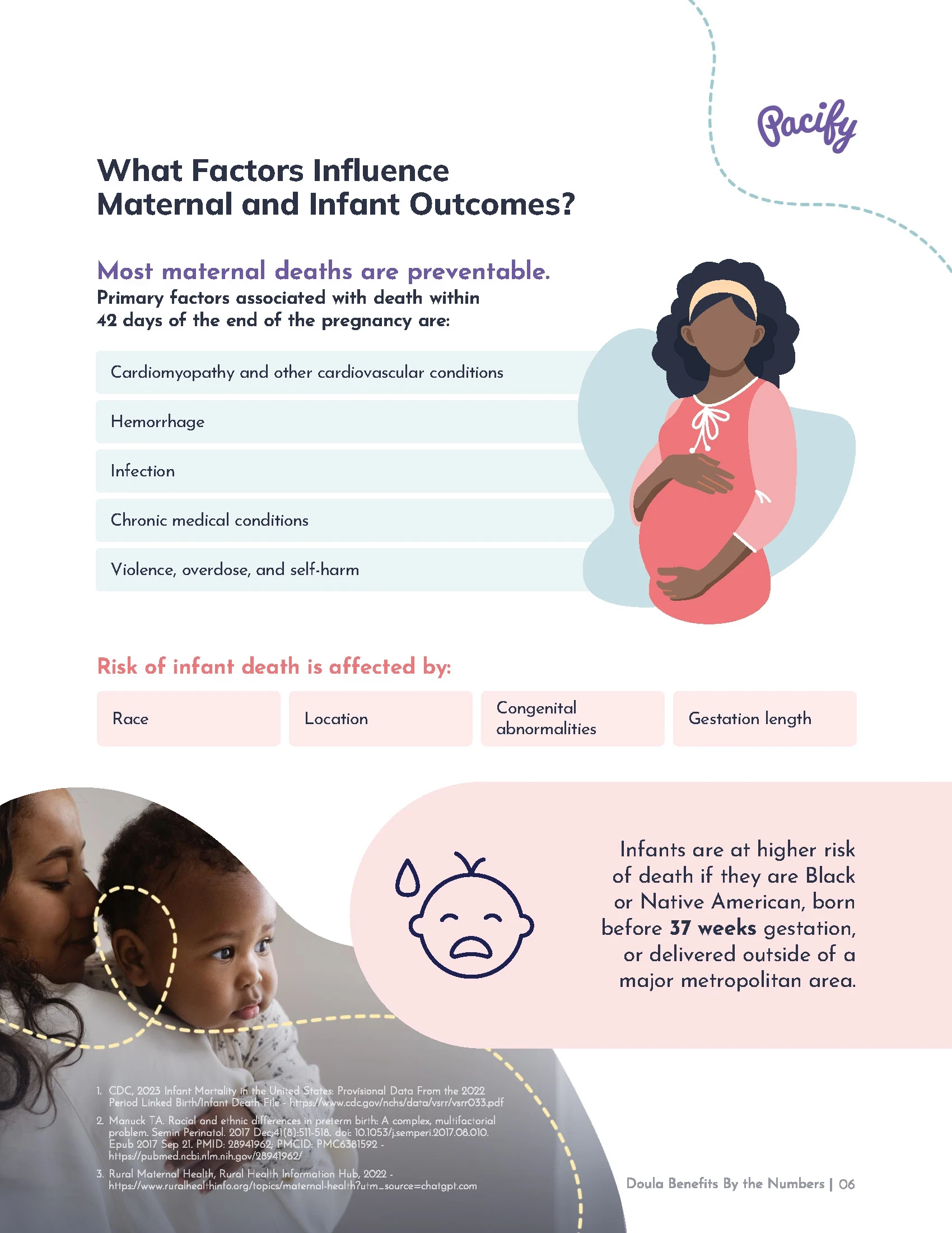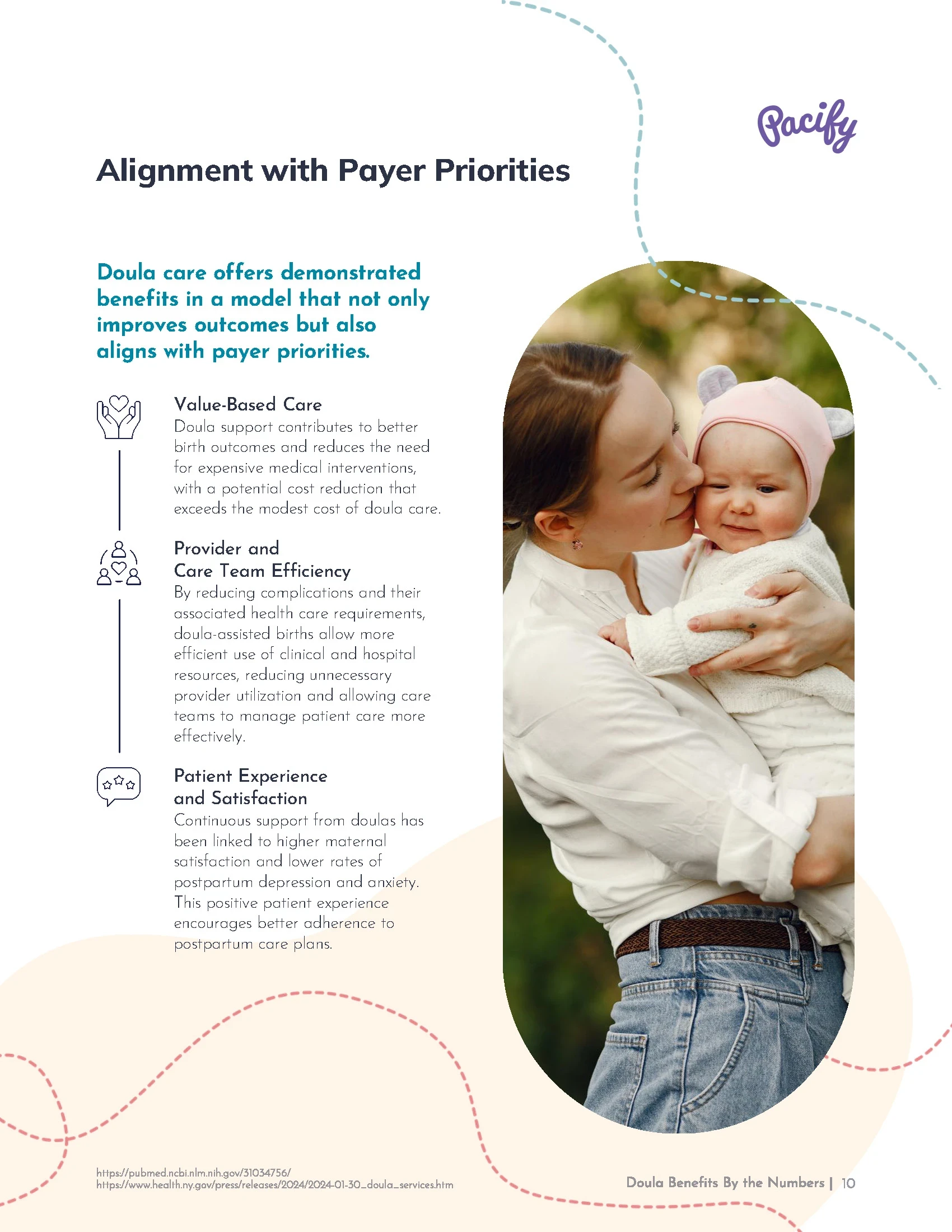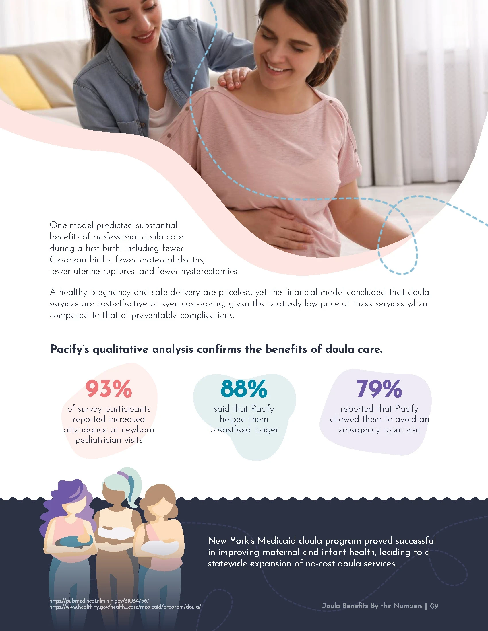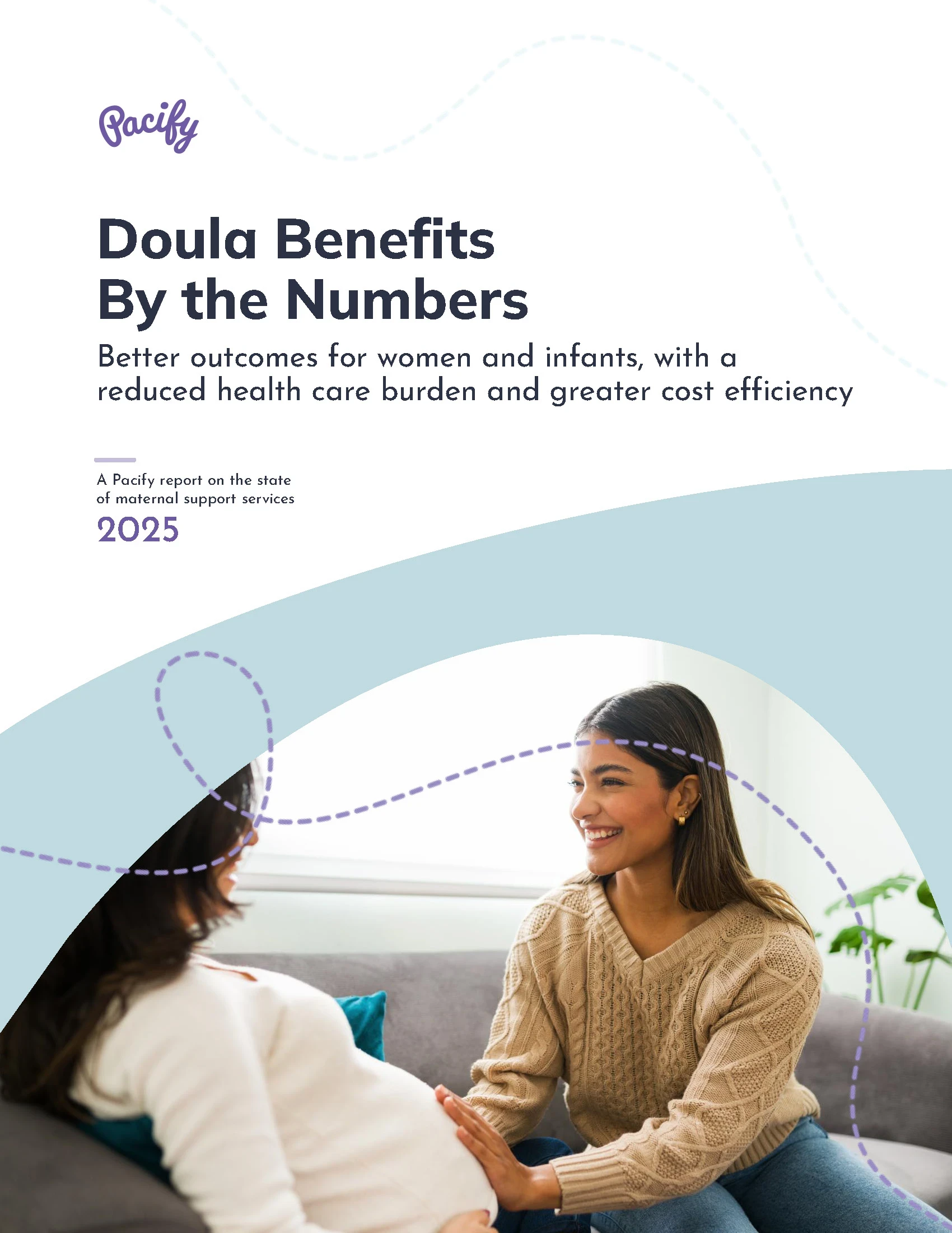 The white paper now works the way Pacify needs it to: as a standalone document that makes the case for doula coverage without anyone from the team in the room to explain it. Payer executives can scan the key takeaways page and immediately understand the cost argument, or read deeper into the outcome data and sourcing when they're ready to evaluate. The design treats every statistic as an opportunity to move the conversation forward, from maternal mortality disparities to Pacify's own 93% satisfaction rate. It's the kind of document that gets forwarded from a benefits director to a CFO, and still holds up when it arrives.